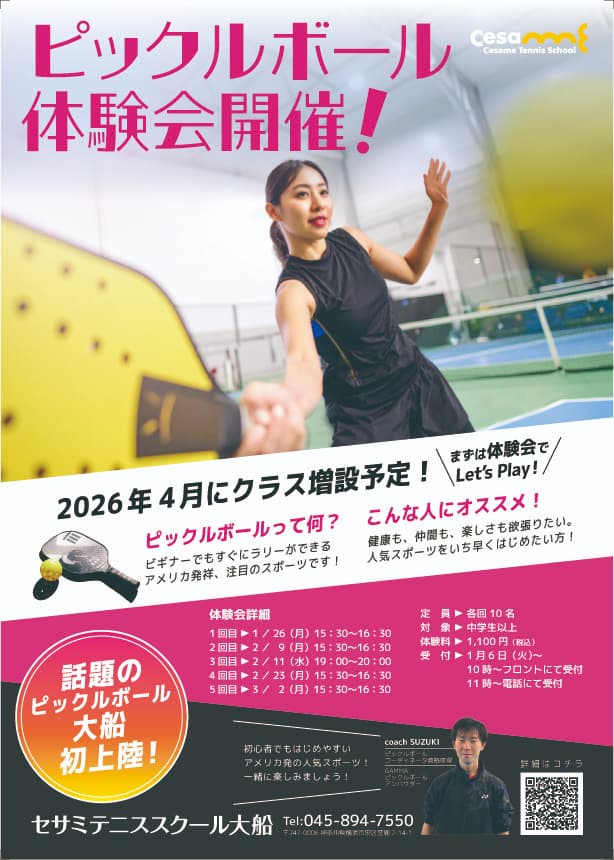 セサミテニススクール大船でピックルボールの体験会を実施します。皆様のご参加をお待ちしております。 内容:簡単なルール説明と各ショットの練習を行います。 対象:中学生以上 受付:2026年1月6日(火)10:00~スクールフロントにて受付開始 、11:00~電話にて受付開始 ※TEL 045ー894-7550 締切:定員になり次第 持ち物:運動できる服装、室内用シューズ、お飲み物 ※パドル(ラケット)は無料でお貸し出しいたします。 ※シューズはレンタル(無料)もありますが数に限りがございます。 |