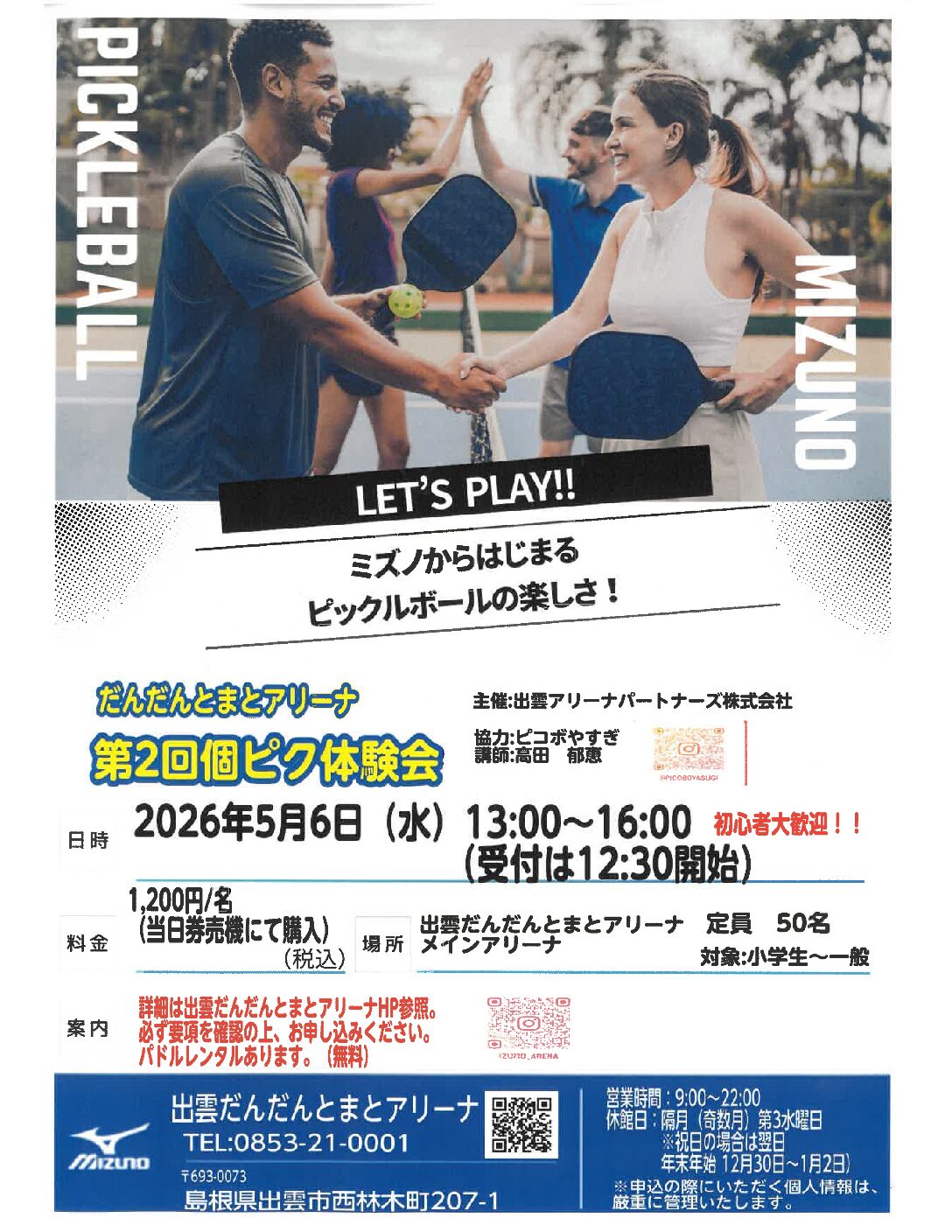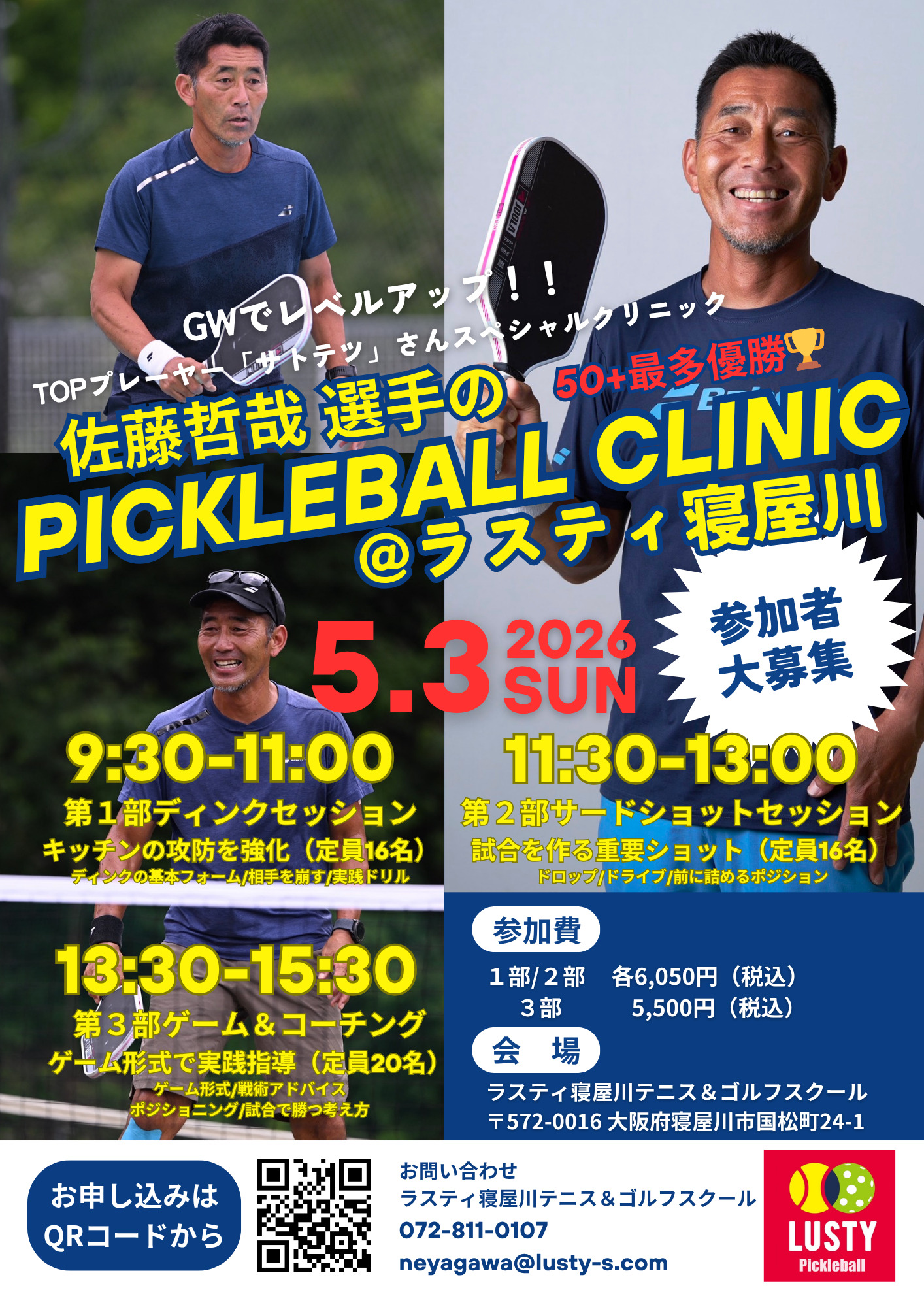 | イベント名 | 5/3佐藤哲哉プロ ピックルボールクリニック in ラスティ寝屋川 |