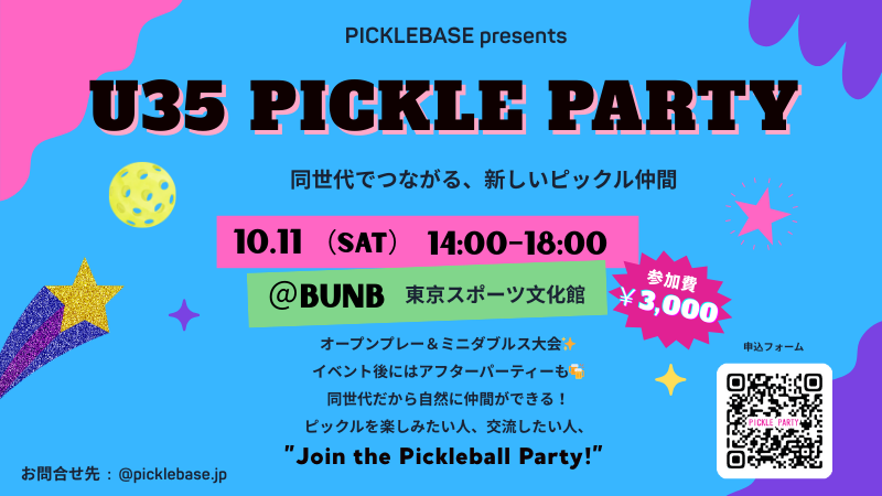 同世代でつながる、新しいピックル仲間をテーマに 35歳以下のピックルボーラー限定のイベントを開催します! 前半はオープンプレーでランダム交流 後半はシャッフルミックスダブルスで景品ありのミニ大会を実施予定。 イベント後はアフターパーティー(任意) コートを飛び出して交流を深めるチャンス。 ピックル談義からプライベートまで盛り上がりましょう!! 【アフターパーティー】 18:30頃〜@新木場or豊洲 予算:5,000円ほど ピックル仲間が欲しい!ダブルスパートナー探し中の方! 素敵な出会いがそこにはあります。ぜひふるってご参加ください! ■申込みはQRまたは下記より |