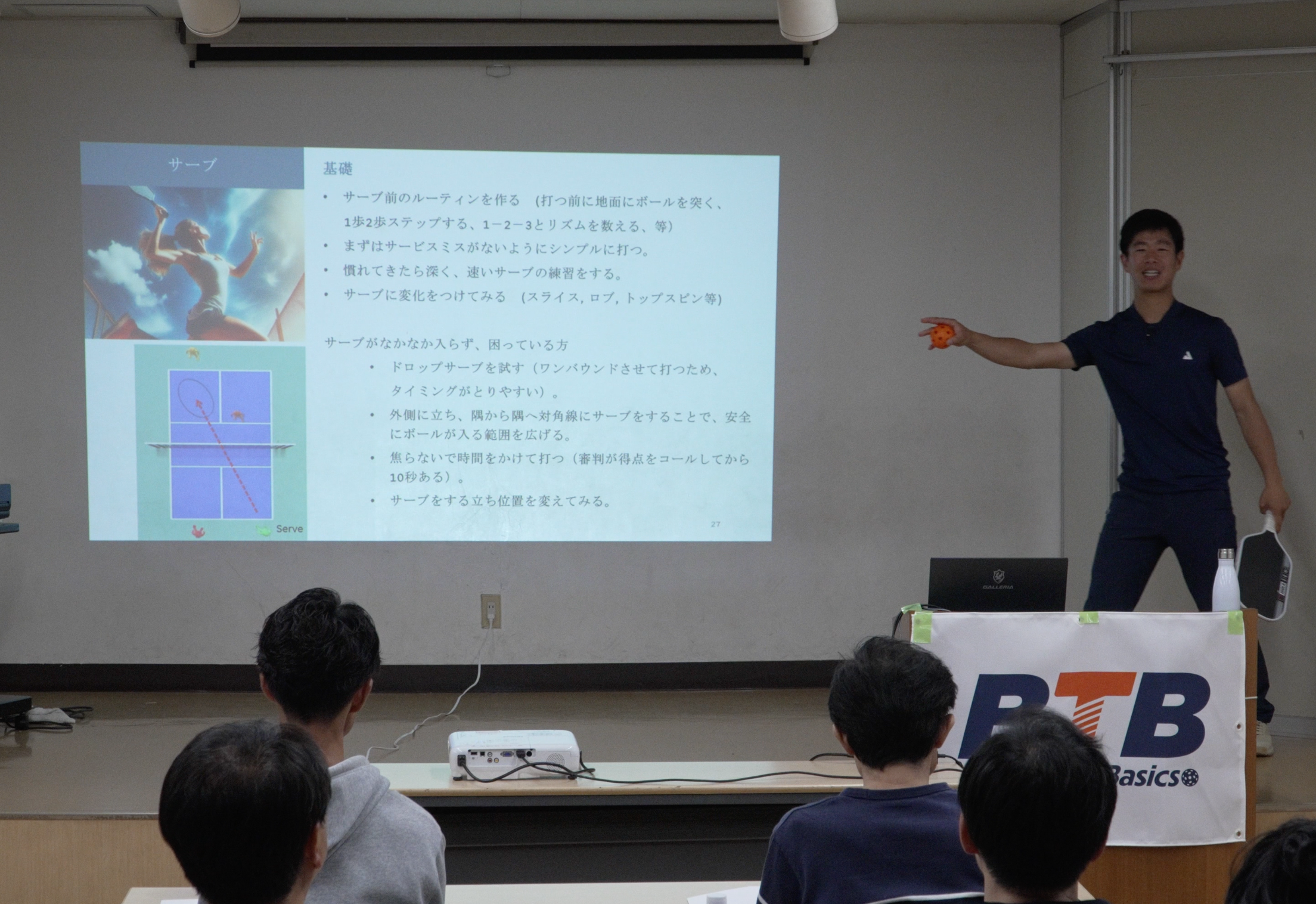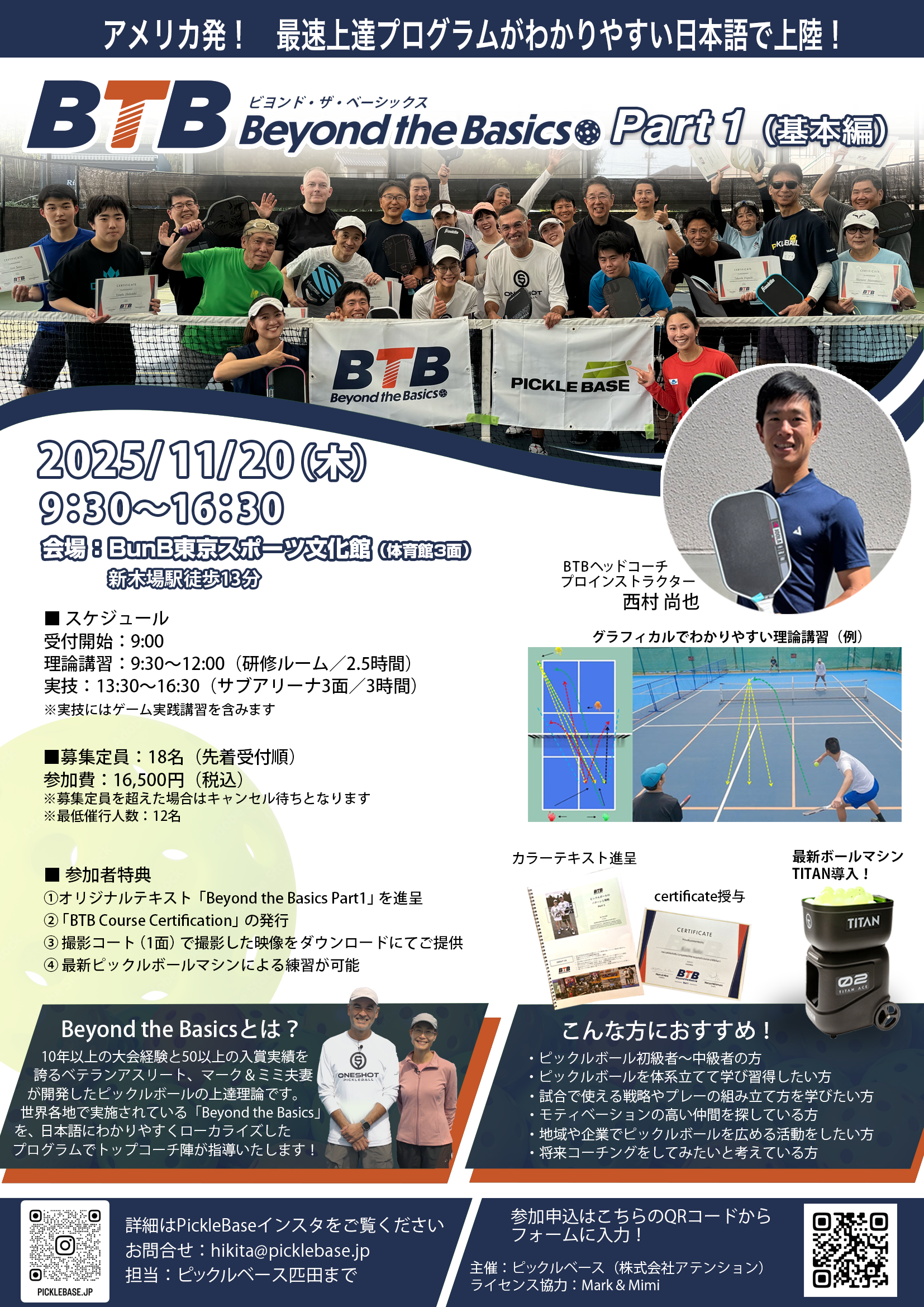 Beyond the basics Part1(基本編)は1dayで【講義】と【実技】の二部構成となります。 【講義】はグラフィックスとアニメーションを多用したパワーポイントで理論をわかりやすく解説します。 【実技】は西村尚也プロインストラクターが丁寧に指導します! ■開催日程 日程:2025年11月20日(水) 時間:9時30分〜16時30分 会場:BunB東京スポーツ文化館 ■当日のスケジュール 受付開始;9時〜 理論講習:9時30分〜12時(会議室/2.5h) 実技:13時〜16時(サブアリーナ3面/3h) ■コーチ BTBヘッドコーチ:西村尚也(プロインストラクター) ■募集定員:18名(先着受付順) 参加費:16,500円(税込) ※募集定員を超えた場合はキャンセル待ちになります ※最低催行人数:12名 ■参加者特典 ①オリジナルテキスト「Beyond the Basics Part1」を進呈 ②「BTB Course Certification」の発行 ③撮影コート(1面)で撮影したご自身のショット映像をYouTubeの限定公開にてご提供 ④最新ピックルボールマシンTitanによる球出しドリル有り ■持参するもの ・パドル ・屋外ハードコート用シューズ ・筆記用具 ・ドリンク ■Beyond the Basicsとは? 10年以上の競技経験と50以上の大会入賞実績を誇るベテランアスリート、マーク&ミミ夫妻 が開発したピックルボールの上達プログラムです。世界各地で実施されている「Beyond the Basics」を、日本語にわかりやすくローカライズした内容でトップコーチ陣が指導いたします! ■こんな方におすすめ! ・ピックルボール初級者〜中級者の方 ・ピックルボールを体系立てて学び習得したい方 ・試合で使える戦略やプレーの組み立て方を学びたい方 ・モティベーションの高い仲間を探している方 ・地域や企業でピックルボールを広める活動をしたい方 ・将来コーチングをしてみたいと考えている方 【BTBの魅力と詳細プログラム】 ■ BTBコンテンツ詳細 【Part 1(基礎編)で学ぶ内容】 • 安全対策&装備 • コミュニケーションスキル • ピックルボールの基本パターン • ゲームの主要局面の理解 • サーブ、リターン、3rdショット(目的、ポジショニング、配置)のポイント • コート上でのパフォーマンス分析 ■コーチ陣のプロフィール 西村尚也(プロインストラクター) @pickleball_sensei_nao 【経歴と主な戦績】 2020年から、元全米王者のダニエル・ムーア氏のアシスタントコーチとして、ツアーやキャンプに帯同。 2023年からは、アメリカのコーチング手法を日本向けにアレンジしたBTBのメインコーチとして活動。 個々の身体操作に合わせた指導を得意とし、日本語教師としての経験も活かし、英語、スペイン語、タイ語を操る言語のスペシャリスト。 ・JPA新潟オープン2025 ダブルス 優勝 ・JPAつくばオープン2024 シングルス ベスト4 ・WPCアジア・オープン2024(タイ)ダブルス(4.5+) ベスト16 ■特典の説明 ①オリジナルテキスト「Beyond the Basics Part1」は講義の内容と連動した作りになっており持ち帰って復習することが可能です ②「BTB Part1 Course Certification」を発行いたします。 ③撮影コート(1面)を使って動画撮影した映像をダウンロードにてご提供いたしますのでご自身のプレーのセルフチェックや実技の復習に活用してください。 ④最新ピックルボールマシンTitanによる球出しドリルでのショット撮影を予定しております。 【参加申込み】 お申込は申し込みフォームURLからお願いします。 ※受付先着順にてお席を確保いたしますので募集定員に達した場合はキャンセル待ちとなります。 みなさまのご参加をスタッフ一同お待ちしております!! |