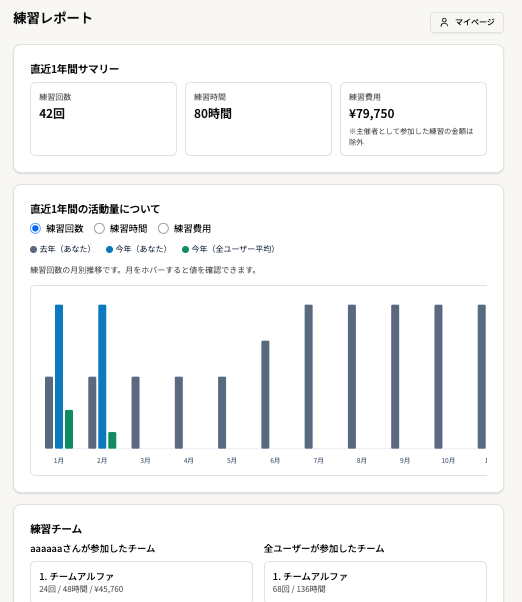 チームやプレイヤーの練習量を可視化することで、練習状況の把握やモチベーション管理などに活用できるとしている。